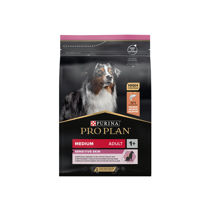 Les croquettes PURINA PRO PLAN Medium Adult Sensitive Skin sont conçues pour répondre aux besoins spécifiques des chiens adultes ayant une peau sensible.