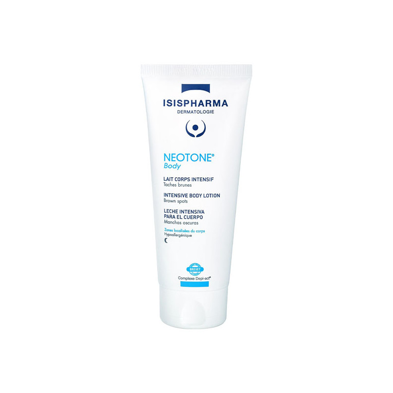 Neotone Body lait corps dépigmentant, favorise l’élimination des taches pigmentaires en agissant à tous les stades de la formation des taches brunes (avant, pendant et après leur apparition) tout en rendant la peau plus douce.
