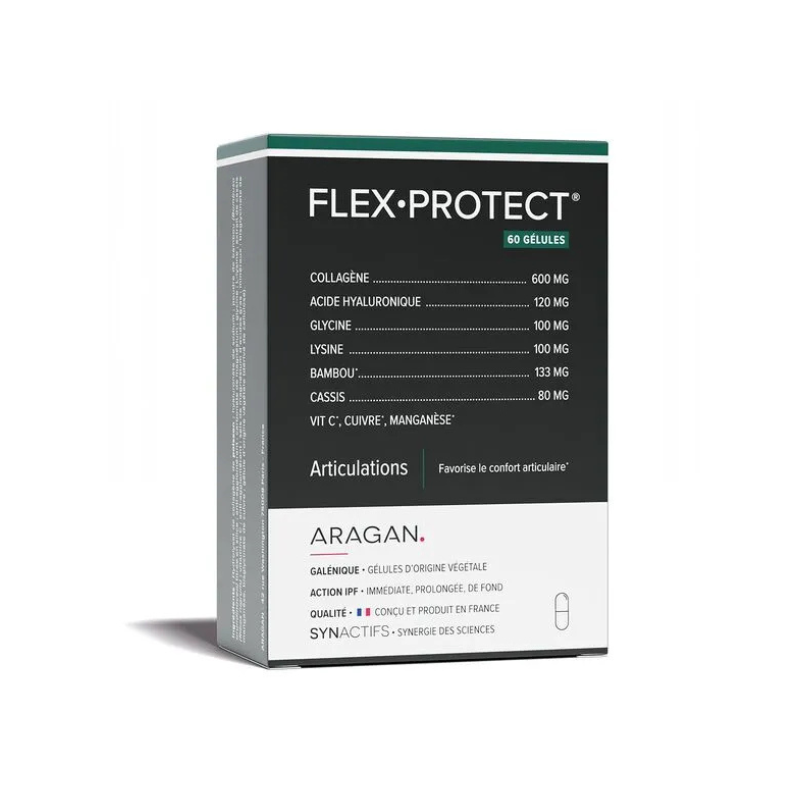FlexProtect contribue à favoriser le confort articulaire grâce à l'association de collagène, acide hyaluronique, glycine, lysine, proline, bambou, vitamine C, cuivre, manganèse et cassis.