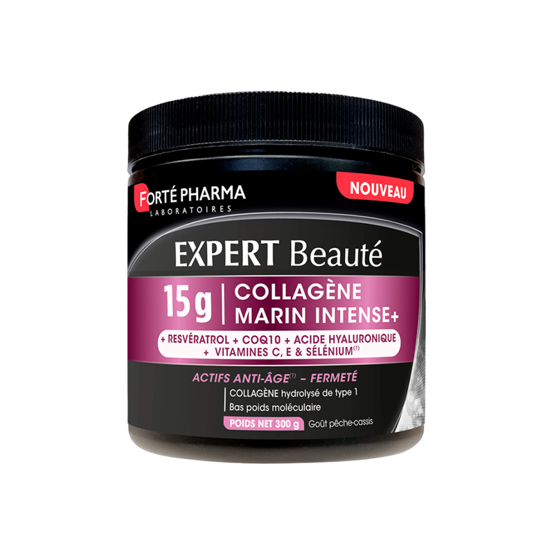 Le collagène marin est associé à des actifs incontournables en beauté : le resvératrol, la coenzyme Q10 (CoQ10) et l'acide hyaluronique. Expert Beauté Collagène Marin Intense+ 15 g est la nouvelle routine beauté hautement dosée en collagène marin qui vous accompagnera facilement au quotidien grâce à son bon goût pèche-cassis et sa bonne dissolution.