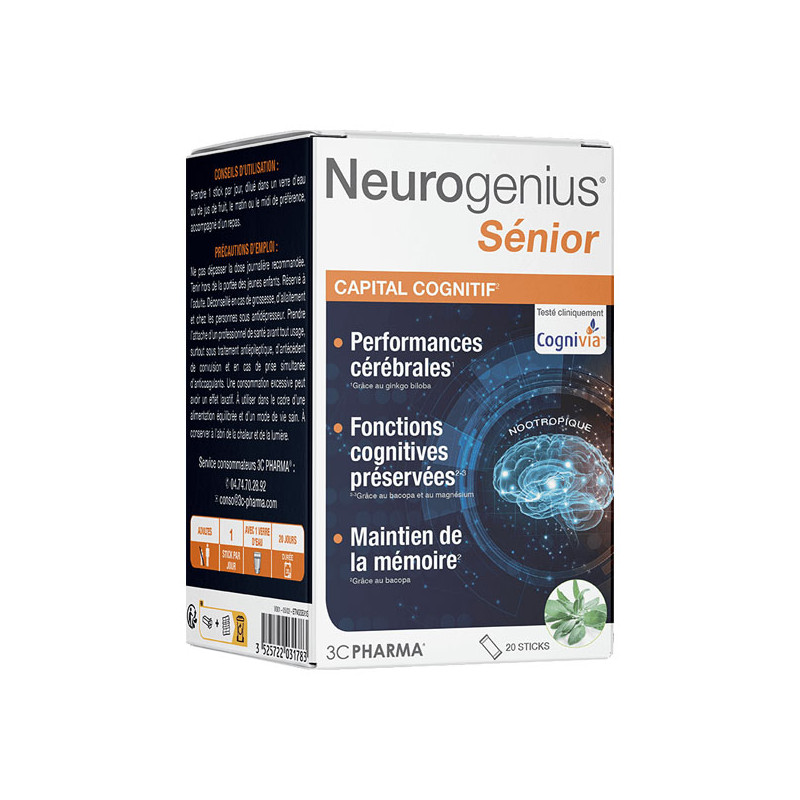 Neurogenius® Senior, formulé par le laboratoire LES TROIS CHÊNES pour la marque 3CPHARMA®, est composé d'actifs spécifiques et de «CogniviaTM»4 (issu de la sauge) testé cliniquement.