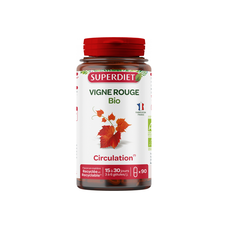 Vigne rouge* (feuilles), Gélule d'hydroxypropylméthylcellulose, Amidon de Riz*, Anti-agglomérant : Talc