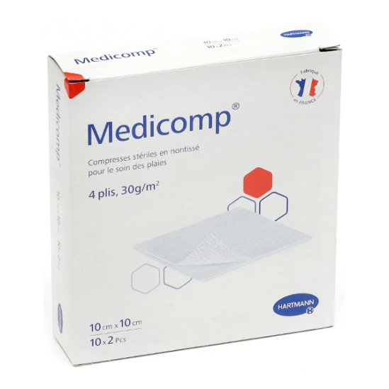 Hartmann Medicomp S 40 Compresses en Non-Tissé Stériles 10 x 10 cm 10 x 2 Pcs sont des compresses en non tissé spécialement indiquées pour le soin des plaies. Douces et résistantes, elles protègent la plaie sans adhérer et ne laissent pas de peluches sur la peau. Stériles, elles permettent une hygiène parfaite.