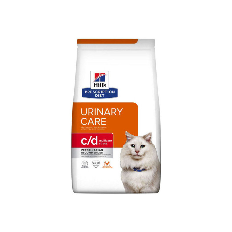 Hill's PRESCRIPTION DIET c/d Multicare Stress Aliment pour Chat au Poulet est un aliment diététique complet en vue de la réduction des récidives de calculs de struvite (cause de maladie du bas appareil urinaire félin, MBAUF), de la dissolution des calculs de struvite et de la réduction de la formation de calculs d'oxalate chez le chat adulte.