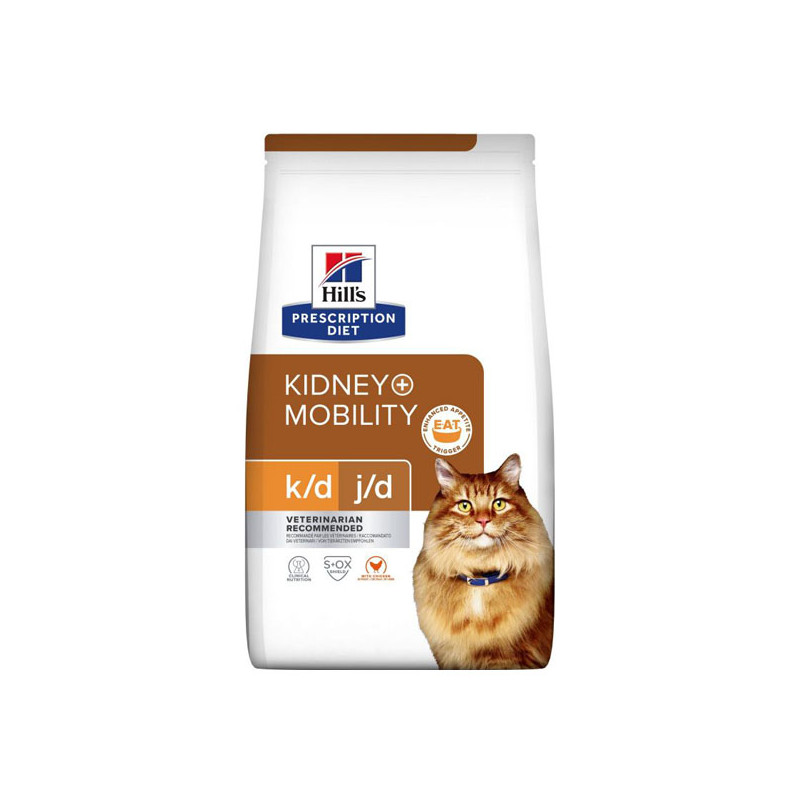 Hill’s Prescription Diet k/d + Mobility - Croquettes pour Chat au Poulet est un aliment diététique complet pour chat développé pour soutenir la fonction rénale en cas d’insuffisance rénale chronique ou temporaire et renforcer le métabolisme des articulations en cas d’arthrose chez le chat adulte.