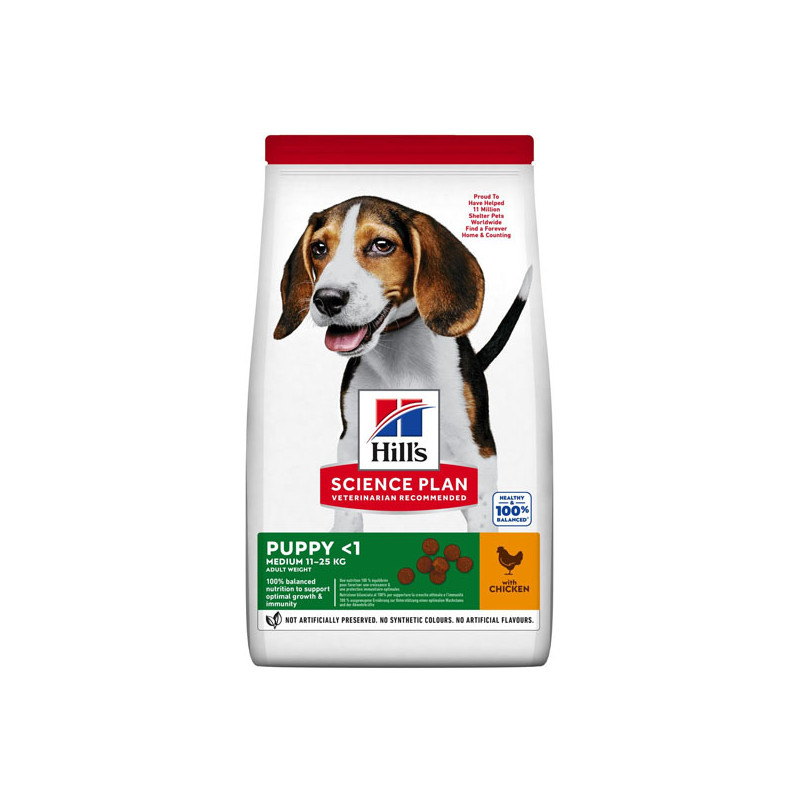 Hill's Science Plan ALIMENT POUR CHIOT MEDIUM au POULET (poulet 17 % ; total volaille 27 %) est aliment complet pour les chiots de taille moyenne jusqu'à l'âge de 12 mois, et pour la chienne en gestation ou en lactation.