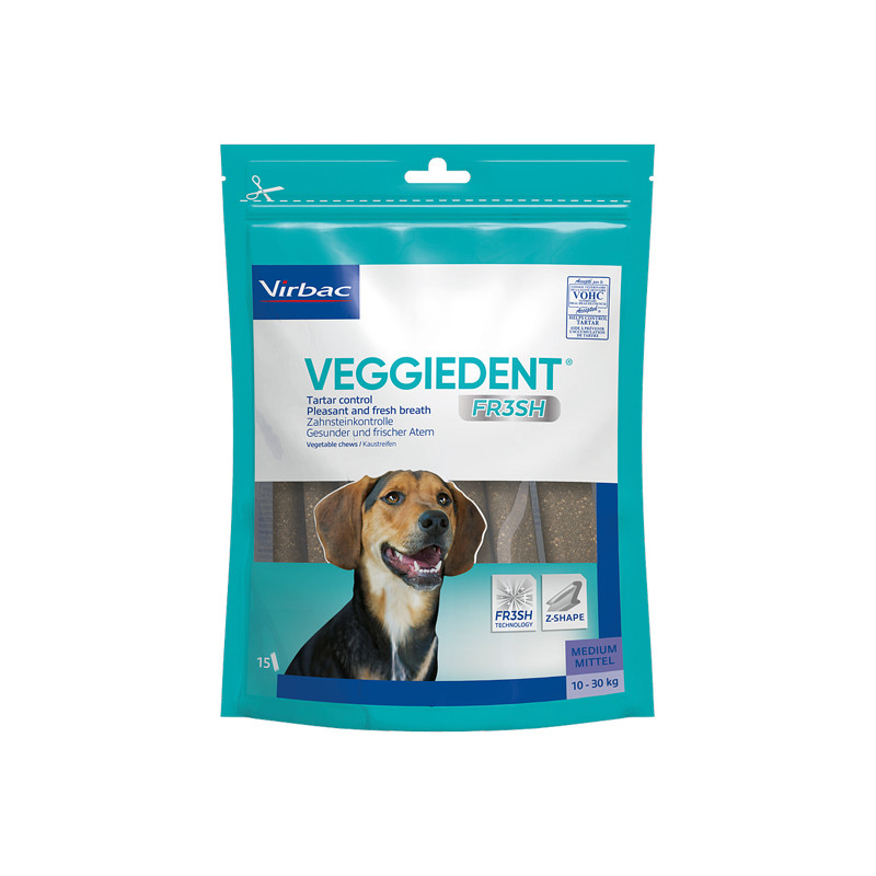 Les lamelles à mâcher VeggieDent avec technologie Fr3sh aident à maintenir une haleine agréable et fraîche.