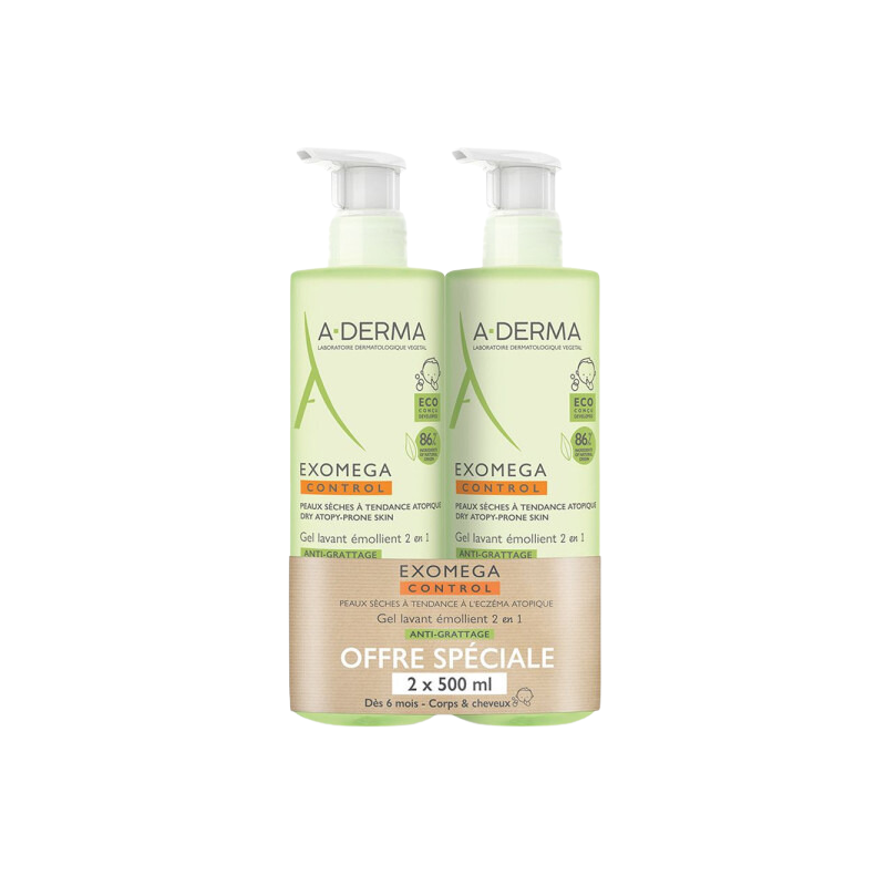 Le Gel lavant émollient EXOMEGA CONTROL nettoie (visage, corps, cheveux), apaise et protège les peaux sèches à tendance à l'eczéma atopique dès la naissance.