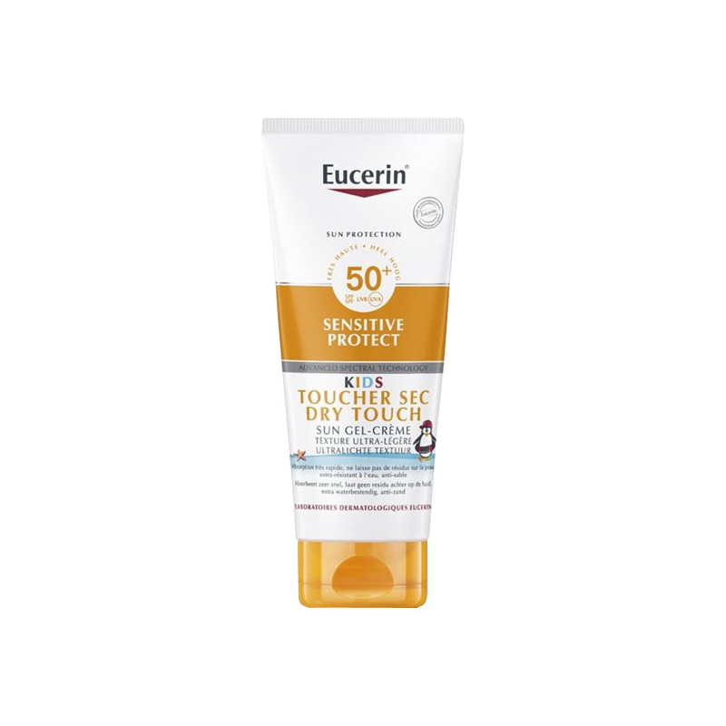 Eucerin Sun Sensitive Protect Kids Gel-Crème Toucher Sec SPF 50+ est un gel-crème solaire pour bébés et enfants qui apaise les peaux jeunes et sensibles et les protège des coups de soleil et des dommages à long terme induits par le soleil.