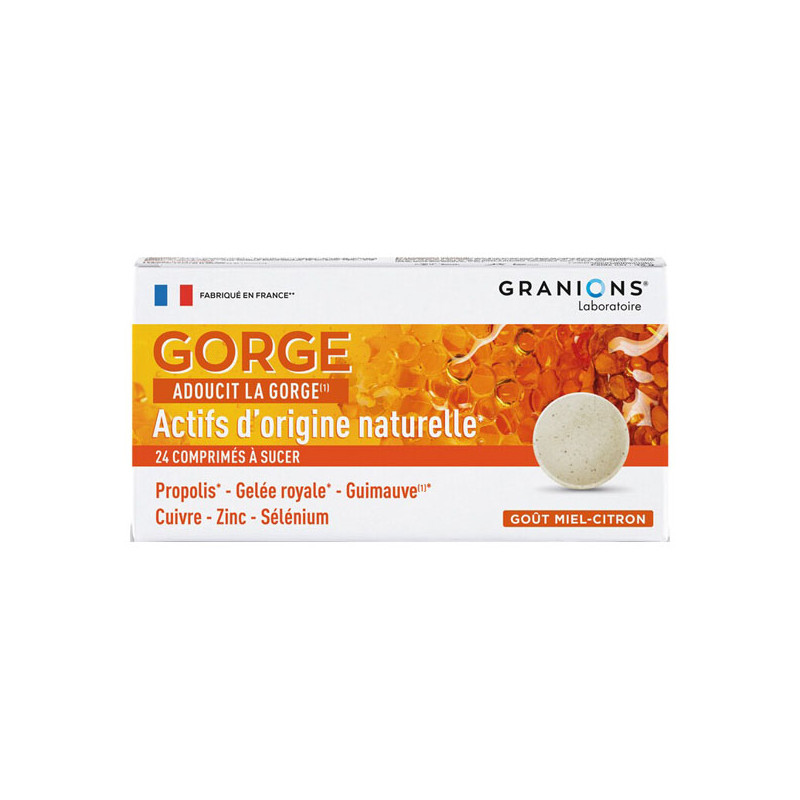 Une pastille à sucer qui permet, grâce à la propolis, à la gelée royale, à la guimauve, au zinc, au cuivre et au sélénium, d'apaiser la gorge.