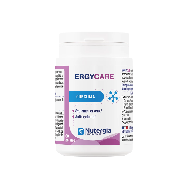 ERGYCARE contient du curcuma aux propriétés antioxydantes et participant au bon équilibre nerveux. La vitamine B3 contribue au fonctionnement normal du système nerveux.