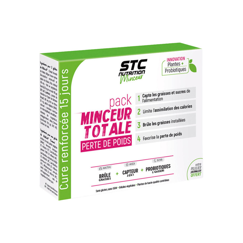 Le Pack Minceur Totale est un programme clé en main de 15 jours qui associe : un bruleur de graisses extra fort (Hydroxyblast) + un bloqueur de calories triple action (Killercal) + une association spécifique de probiotiques pour soutenir la flore intestinale (Mafloril gasseri)