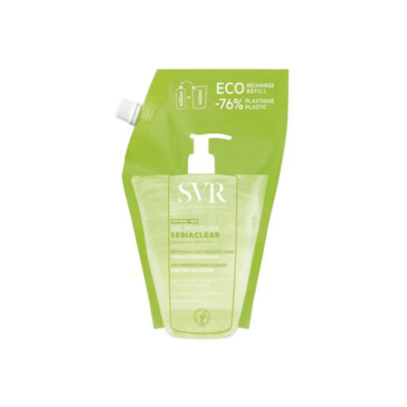 - Verser le gel moussant de l’éco-recharge dans le flacon de Sebiaclear Gel moussant 400ml ou de votre flacon préféré.