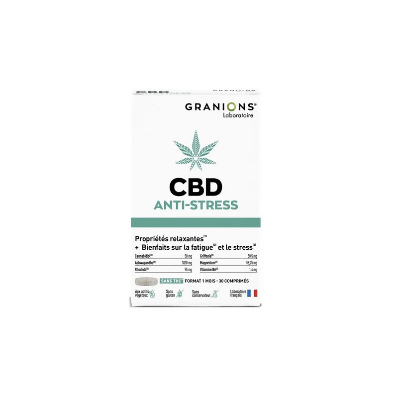 GRANIONS CBD Anti-Stress est un complément alimentaire formulé pour réduire le stress et la fatigue tout en favorisant la relaxation, la détente et l'équilibre émotionnel. Chaque comprimé contient une formule complète, riche en CBD (50 mg d'isolat, dosage maximal autorisé), associé à des plantes, des vitamines et du magnésium, offrant des propriétés relaxantes et des bienfaits contre la fatigue et le stress.