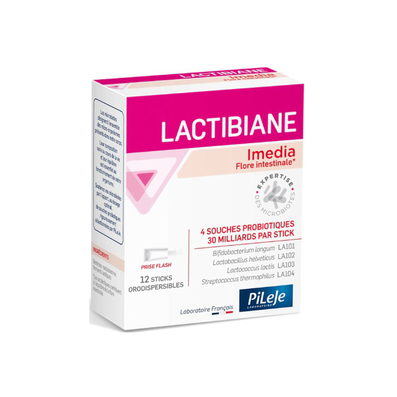 Lactibiane Imedia est un complément alimentaire à base de 4 souches probiotiques dosées à 30 milliards par stick orodispersible.