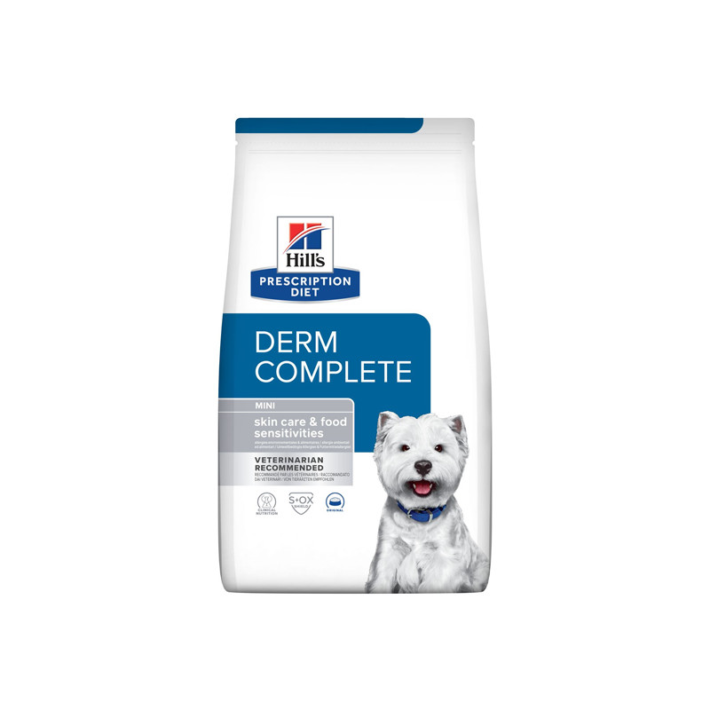 Hill's PRESCRIPTION DIET Derm Complete Mini Aliment pour Chien est un aliment diététique complet en vue du soutien de la fonction cutanée en cas de dermatoses et de dépilations exacerbées et pour la réduction des intolérances à certains ingrédients et nutriments chez le chien adulte.
